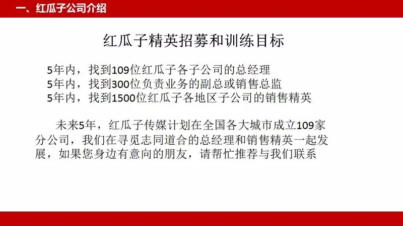 紅瓜子愿景是打造卓越的上市企業,建設優秀的民族品牌,目前有6個地區的子公司,2018年底拓展到25個子公司,2019年底拓展到50個子公司,2020年底到100個子公司,紅瓜子計劃2022年上市,登上創業板.