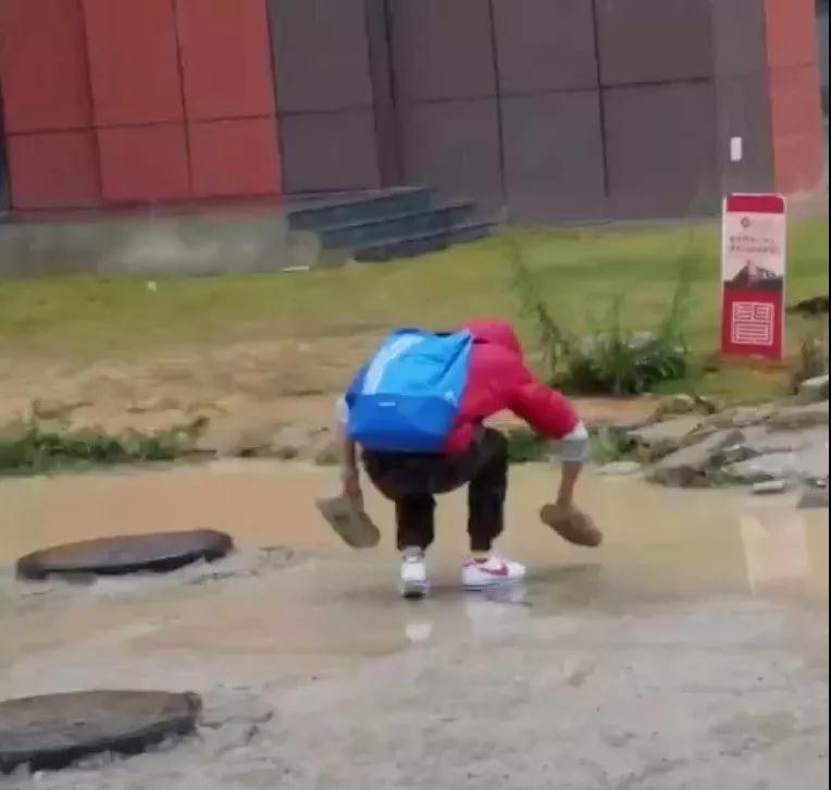 暴雨過后,一個背書包的男孩,在一段滿是積水的路上停了下來。