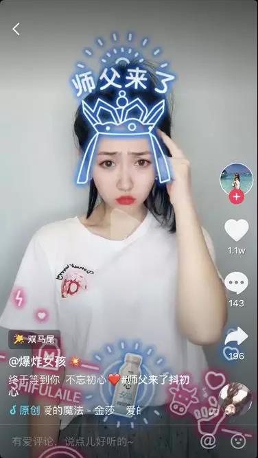 酷炫的燈管風,右下角不斷冒出小心心,整個貼紙動態(tài)呈現(xiàn)。當你炫技完成,向鏡頭比心時,“師父來了”四個字就被觸發(fā),特效貼紙畫面隨之到來。