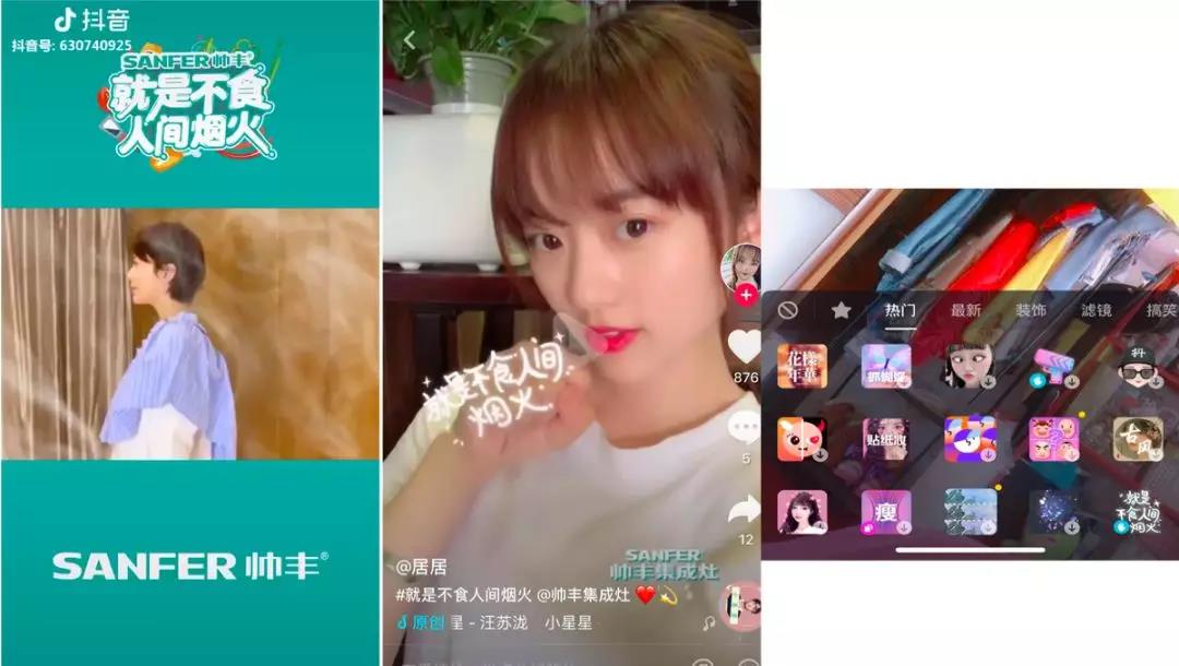 除了明星之外,帥豐集成灶還邀請三界接線員@仙女酵母、可愛少女@吃不胖娘、抖音第一女神@阿純(全網男女通用臉)三位千萬級抖音達人參與挑戰賽,三位達人根據品牌特點與各自優勢,制作出體現“不食人間煙火”、保持顏值等內容的優質參賽視頻,活動期間三位達人參賽視頻播放總量達1300萬,達人優質視頻內容獲23.6萬點贊。值得指出的一點是,達人視頻腳本設計戳中用戶痛點,能與品牌軟性結合,有效提升了用戶好感度。