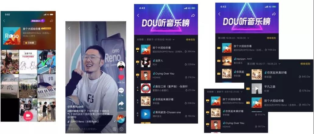這條單曲使用近50萬次,持續3周霸占品牌DOU聽音樂榜榜首,不少用戶表示“被音樂征服”。@我家大鼠條 等達人使用單曲的作品均獲得100萬+點贊。朗朗上口的旋律,帶動品牌迅速走紅全網,被篩選后留下的廣告也為OPPO沉淀了豐富的音樂資產。