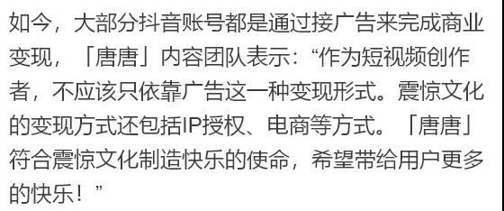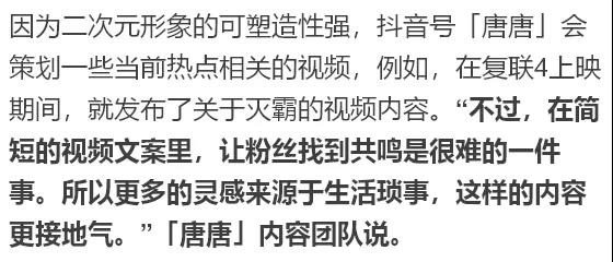 「唐唐」內容團隊說:“今年1月份才入駐抖音,最初其實是純粹想吐槽,沒想到一下就火了。看到市場熱度很好,我們就接著繼續做了下去。”