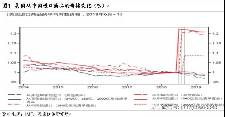 隨后IMF在5月份發布了一份重要的報告《TheImpact of US-China Trade Tensions》,研究了加征關稅后中國對美出口產品到岸價的變化,發現最早500億美元商品關稅上調25%之后,美國到岸價漲幅在20%左右;而2000億美元商品關稅稅率上調10%之后,美國到岸價漲幅在8-9%。也就是說,對中國產品征收的關稅絕大部分體現為到岸價的提升。