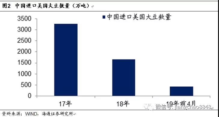 我國是美國最大的農產品出口市場,尤其是大豆。根據中國海關的數據,我國17年進口了3285萬噸的美國大豆,然而在18年中美貿易摩擦爆發之后,18年我國進口美國大豆數量下降了一半至1664萬噸。而在19年的前4個月,我國進口美國大豆數量同比又萎縮了70%。