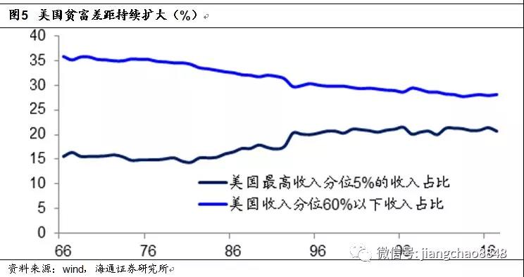 根據美國商務部普查局的數據,美國住戶中收入低于60%分位的家庭,其收入占比已經從1966年的36%降至目前的28%。而在考慮了通脹的變化以后,美國收入低于40%分位的家庭,其實際收入在過去40年幾乎沒有變化。