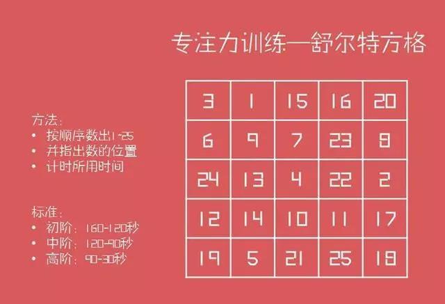 嘗試一下針對(duì)某件事進(jìn)行冥想。在冥想的過程中,我們很容易想到其他的事情,這時(shí)我們就要有意識(shí)地提醒自己,要專注思考這件事。或者通過“舒爾特方格”(如下圖)去練習(xí),提升你的專注力。