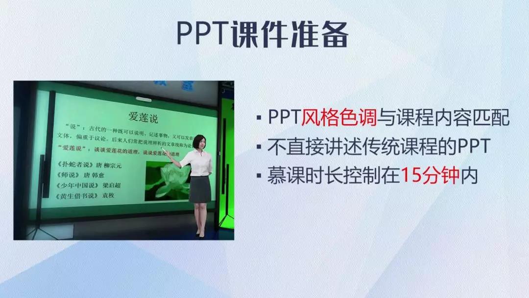 拍攝慕課出鏡老師準(zhǔn)備事項(xiàng)1.授課ppt準(zhǔn)備PPT課件要求PPT應(yīng)盡量簡潔,每一頁內(nèi)容不要太多,最好是一張圖,一行要點(diǎn)。